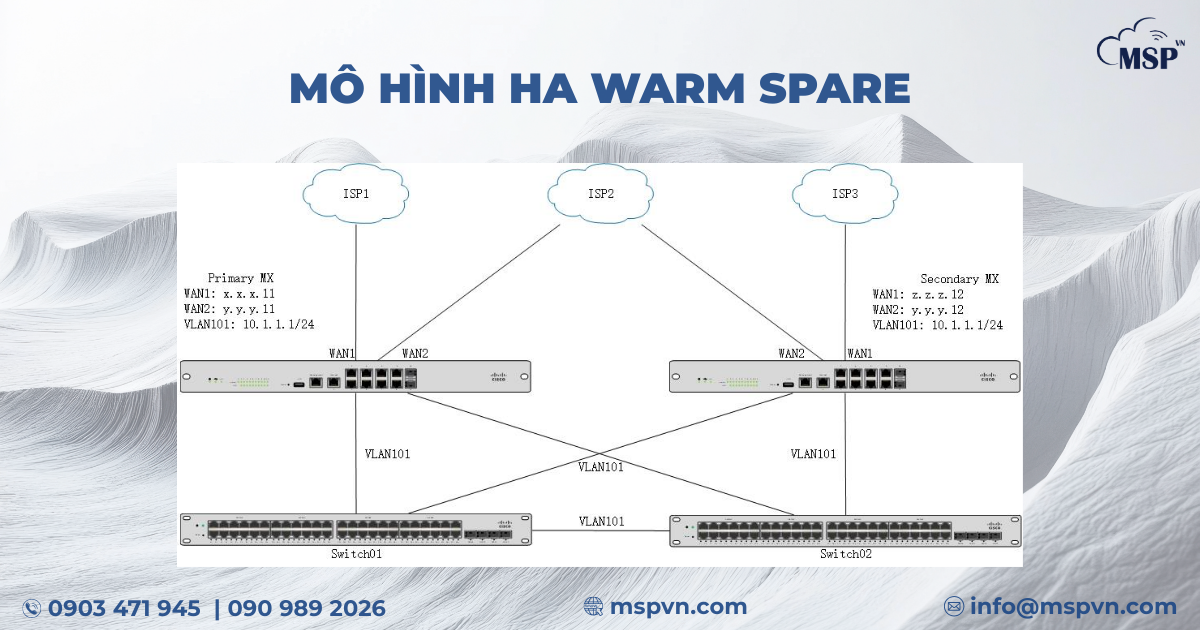 Trong hệ thống Cisco Meraki Firewall, HA được triển khai thông qua cơ chế Warm Spare. Đây là mô hình dự phòng chủ động, trong đó hai thiết bị firewall được cấu hình để hoạt động cùng nhau.