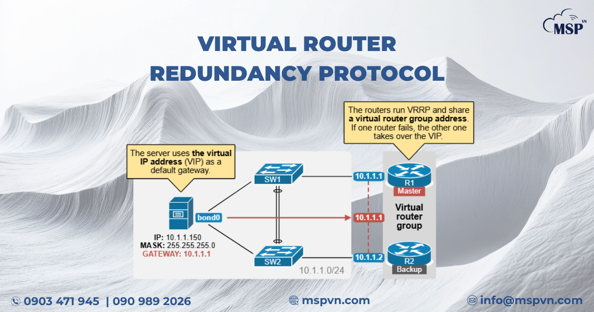 VRRP cho phép nhiều thiết bị mạng cùng chia sẻ một địa chỉ IP ảo để hoạt động như một router logic duy nhất. Trong mô hình HA, VRRP đóng vai trò theo dõi trạng thái của các thiết bị firewall.