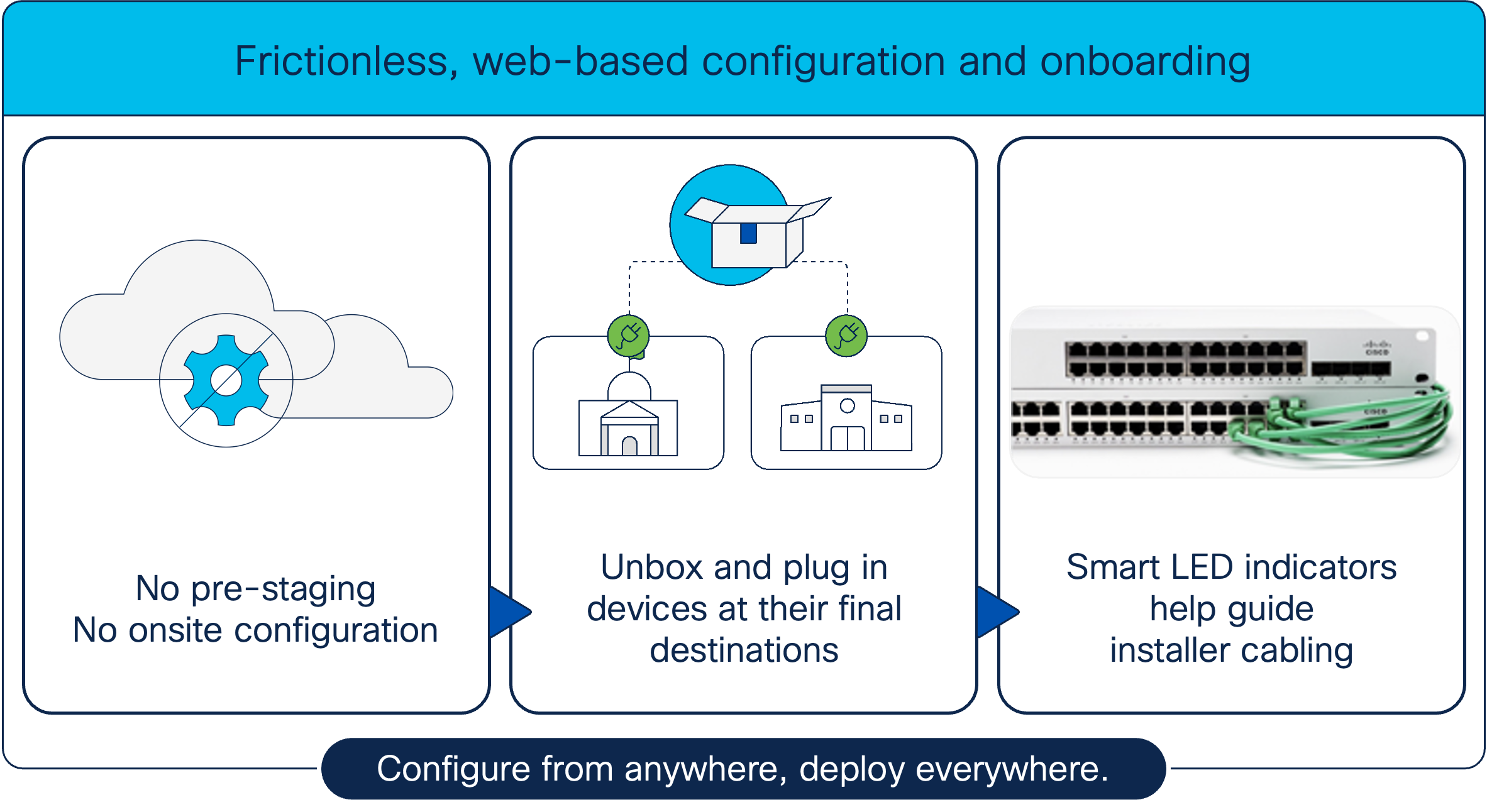 Việc triển khai Meraki MS rất dễ dàng nhờ tính năng “zero-touch provisioning” – thiết bị tự động nhận cấu hình khi kết nối vào hệ thống. Điều này đặc biệt hữu ích với các doanh nghiệp có nhiều điểm triển khai hoặc đội ngũ IT hạn chế.