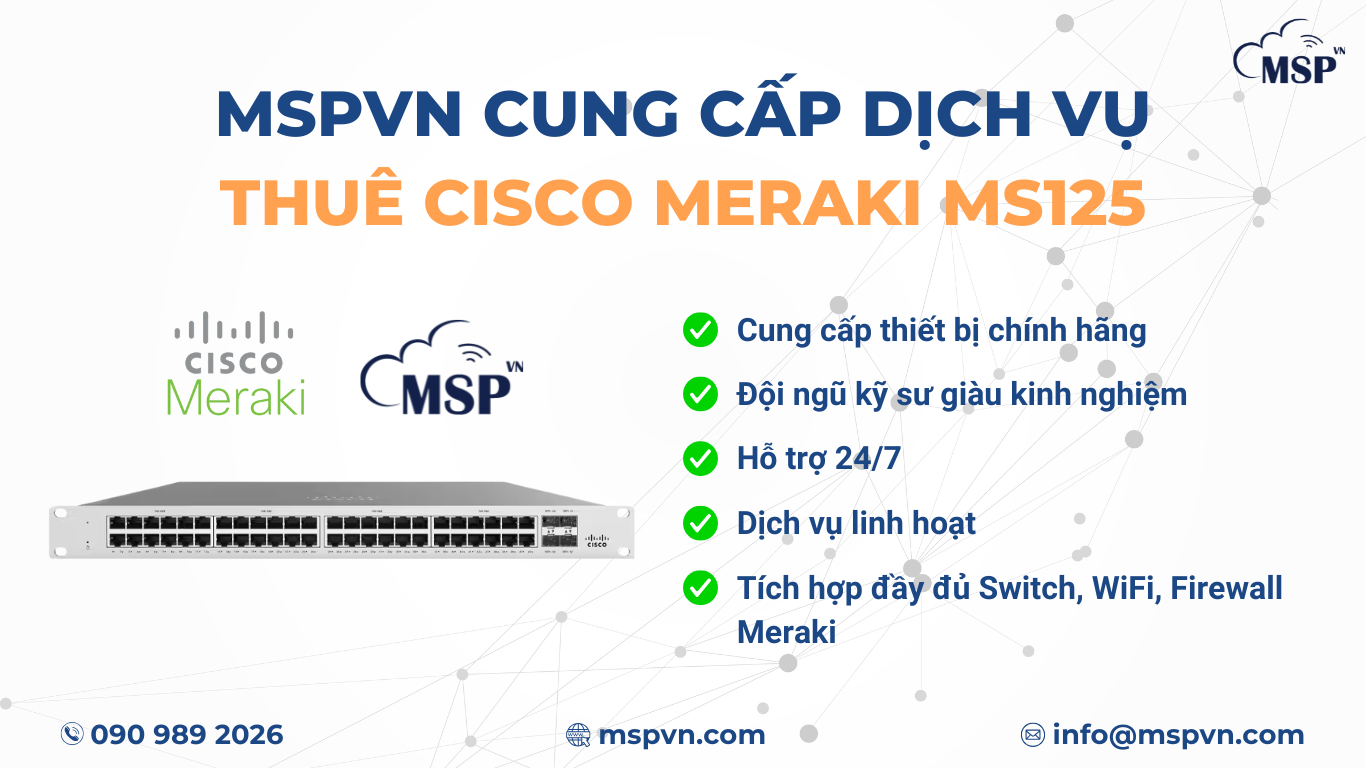 Không phải doanh nghiệp nào cũng muốn đầu tư CAPEX lớn cho hạ tầng mạng. Tại MSP, chúng tôi cung cấp dịch vụ thuê switch Cisco Meraki MS125 cùng các thiết bị đi kèm như WiFi Meraki MRFirewall Meraki MX.