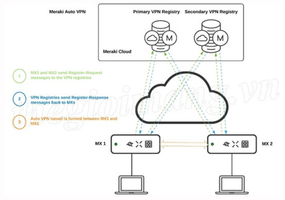 Lưu ý: Meraki thực hiện việc đóng gói và mã hóa luồng giữa các MX, vận hành routing/forwarding trên overlay. Việc chi tiết hóa thuật toán mã hóa hay giao thức thấp tầng không cần thiết cho việc vận hành hàng ngày; quan trọng là Dashboard quản lý toàn bộ.