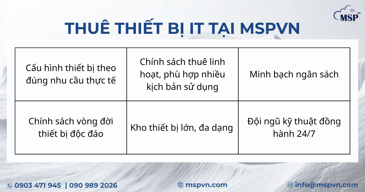 Ở phần tiếp theo, chúng ta sẽ cùng tìm hiểu dịch vụ thuê thiết bị IT của MSPVN có gì nổi bật và vì sao đây là lựa chọn phù hợp cho doanh nghiệp nhỏ tại Việt Nam.